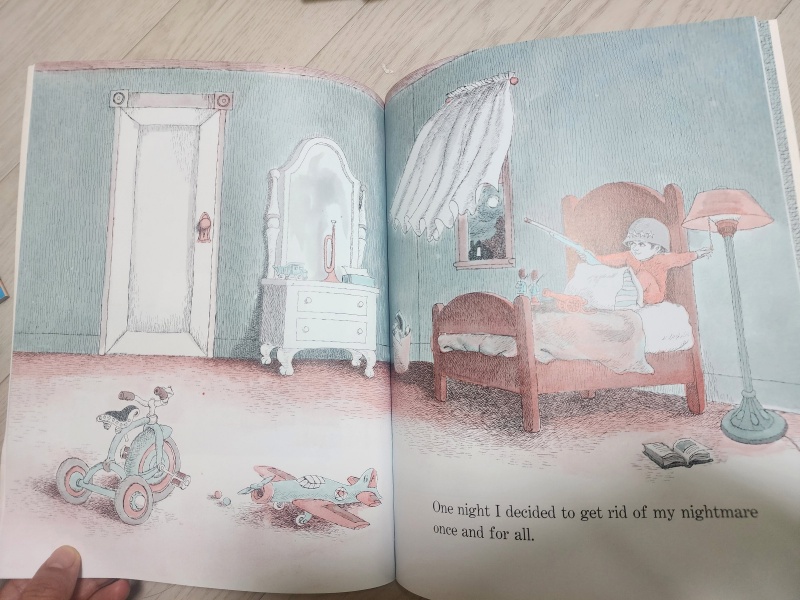 『There's a Nightmare in My Closet』는 옷장 속 괴물을 두려워하는 어린 소년의 용기 있는 모험을 그린 작품입니다. 아직 혼자 잠들기 어려운 소년은 매일 밤 옷장 문을 꼭꼭 닫습니다. 두려움은 있지만, 이번에는 달리 대처하기로 결심합니다. 장난감 총을 들고 이불 속에 숨어 있다가 옷장 문을 활짝 엽니다. 그러자 상상 속 괴물, 악몽이 모습을 드러냅니다. 전형적인 무서운 모습의 괴물이지만, 예상치 못한 반전이 기다리고 있습니다. 총을 들이민 아이 앞에서 악몽은 으르렁거리는 대신 울음을 터뜨립니다. 당황한 아이는 곧 괴물을 진심으로 위로하고, 함께 이불을 덮고 침대에 눕습니다. 무서운 존재였던 악몽은 이제 따뜻한 동반자가 됩니다. 마지막 장면은 아이와 악몽이 평화롭게 나란히 잠든 모습입니다. "아마 옷장에 또 다른 악몽이 더 있겠지만, 세명이 눕기에는 내 침대는 부족해"라는 문장은 소년이 두려움을 극복하는 순간을 위트있게 보여줍니다 . 짧은 이야기 속에 공포를 마주하고, 상대를 이해하며, 관계를 형성하는 깊은 감정의 여정이 담겨 있습니다.