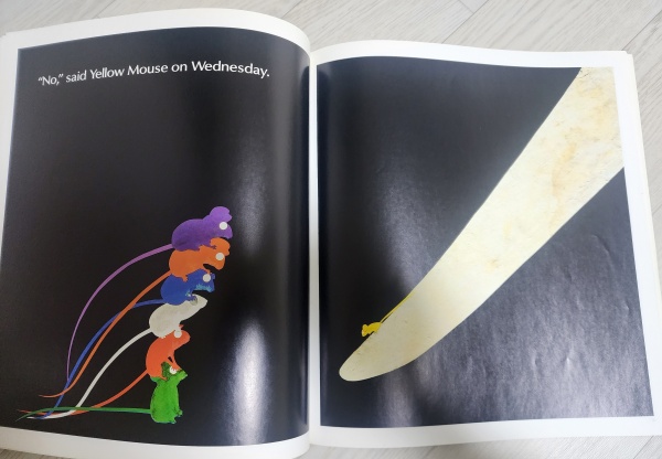에드 영의 일러스트는 콜라주 기법을 활용해 각 생쥐를 뚜렷한 색으로 구분하고, 밤의 어두운 배경과 대비되도록 표현했습니다. 색채는 단순하지만 강렬하고, 여백이 많아 시선의 흐름을 자연스럽게 유도합니다. 각 생쥐가 등장할 때마다 페이지에 변화가 생기고 각 장의 텍스트와 이미지가 조화롭게 어우러져서 독자들은 이야기를 따라가면서도 자연스럽게 시각적 은유를 경험하게 됩니다.